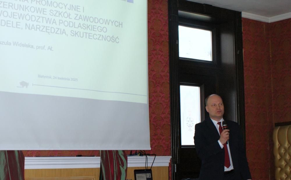 Część merytoryczną seminarium rozpoczął wykład prof. Urszuli Widelskiej z Akademii Łomżyńskiej. Zrealizowane przez zespół pracowników naukowych uczelni badanie skupiało się na analizie modeli i narzędzi działań promocyjnych funkcjonujących w naszym województwie szkół zawodowych oraz ocenie ich skuteczności. Badanie ukazało nie tylko kluczowe wyzwania w promowaniu szkolnictwa zawodowego w województwie podlaskim, lecz także wskazało konkretne działania, które mogą zwiększyć jego atrakcyjność i skuteczność: inicjowanie współpracy między szkołami a interesariuszami, wykorzystywanie mediów społecznościowych czy wdrażanie innowacyjnych strategii promocji i edukacji.